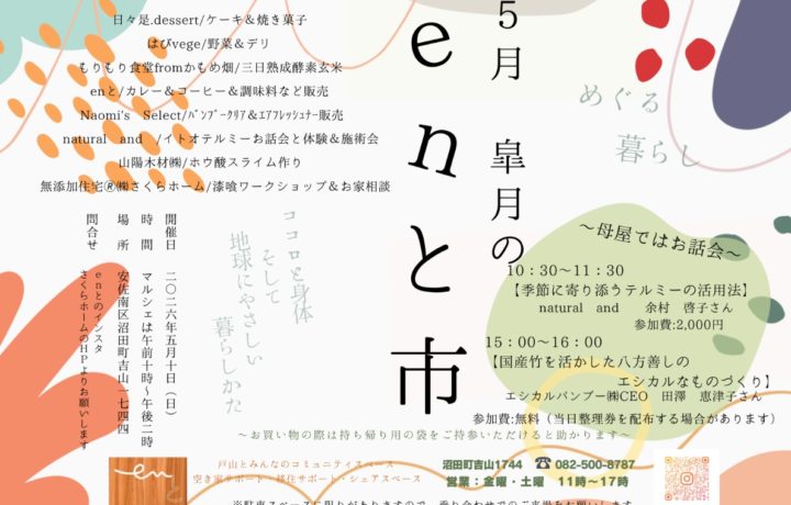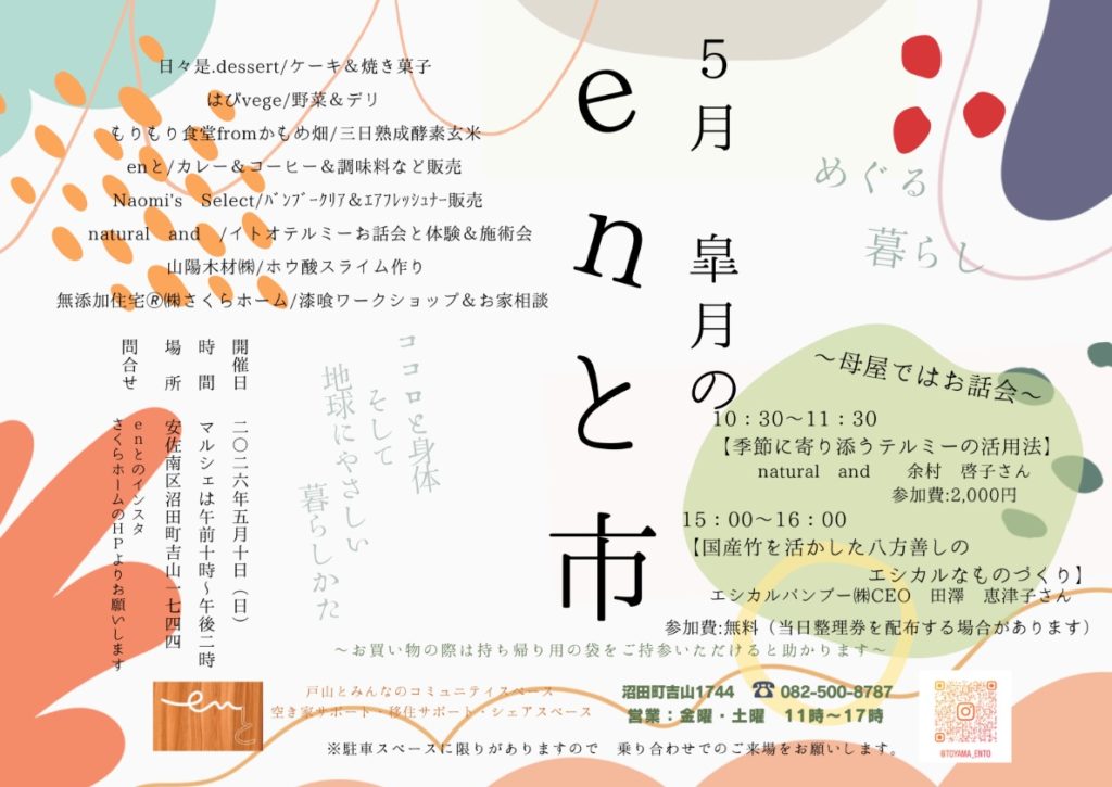2026.04.06 5月皐⽉の『enと市』 戸山とみんなのコミュニティスペース『enと』では、5月10日にイベントが開催されますこの機会に是非ご参加ください。 湯来町の古民家・土蔵をサウナに 前の記事 野草の効き目講座 次の記事